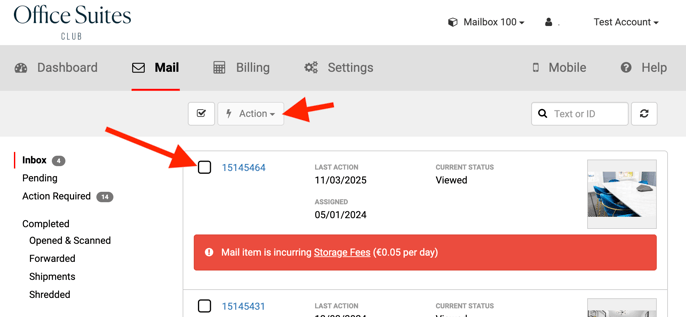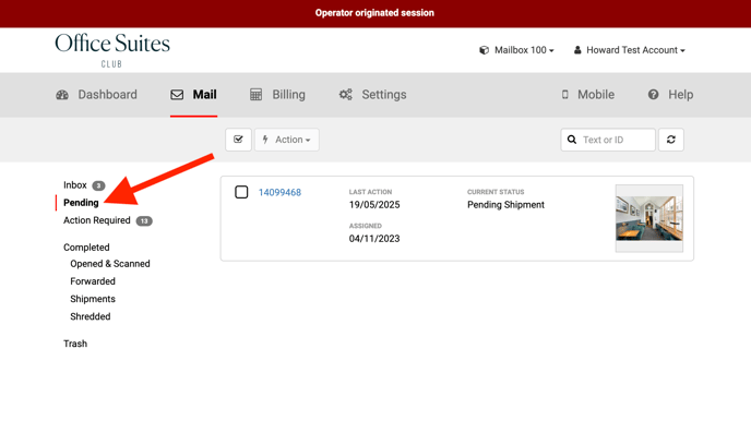 Pending Shipments: After requesting a forward, log in to the Mail Platform and go to Mail Tab > Pending. Your item will appear as “Pending.”
